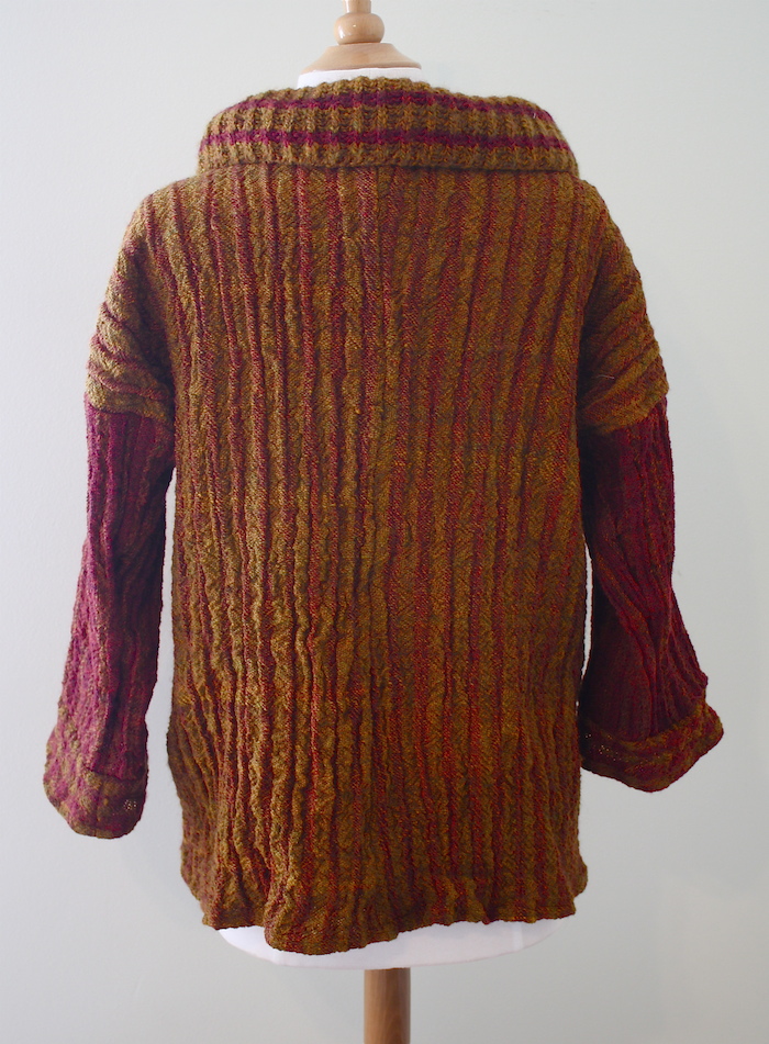 The sleeves and inside front panel used burgundy yarn as weft -- shown below.